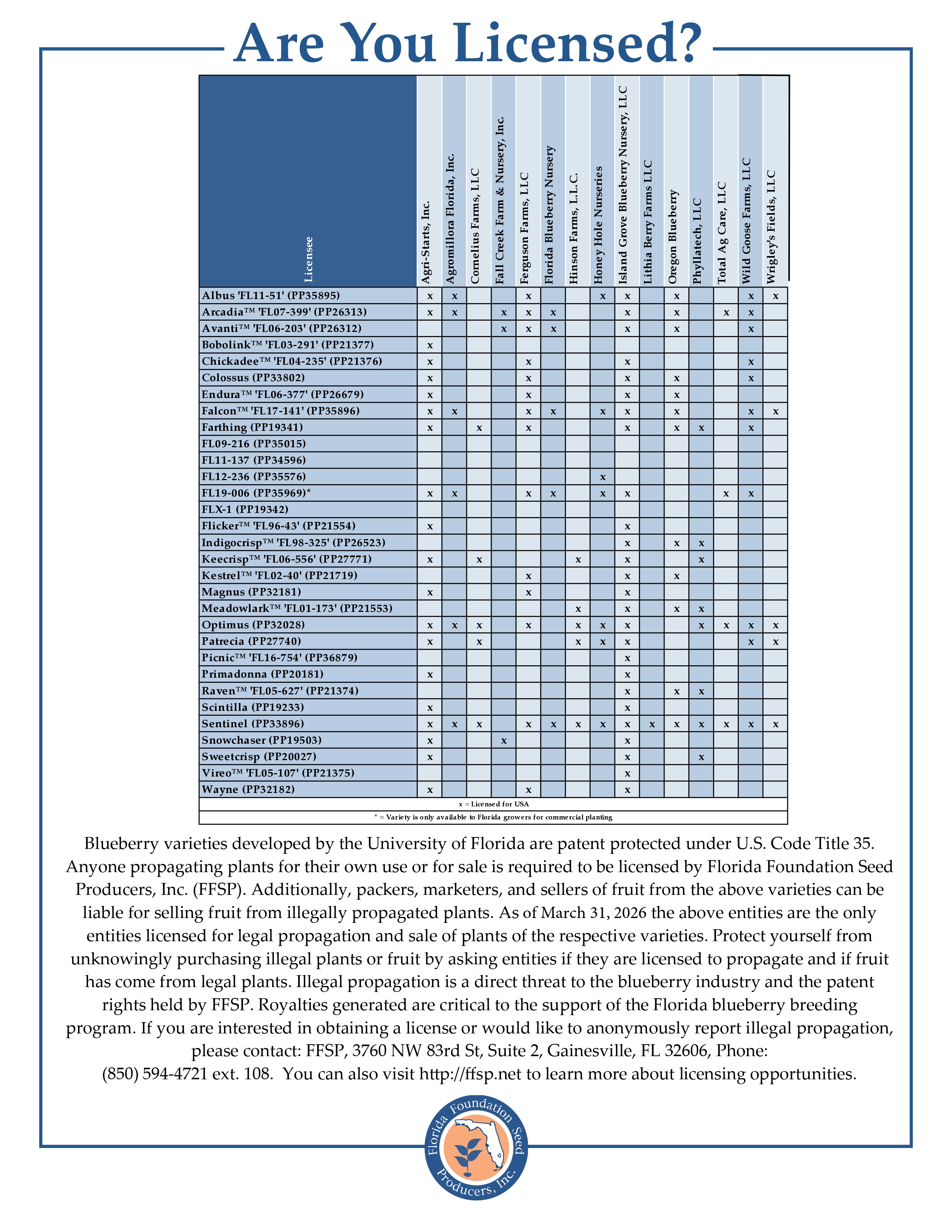 Blueberry varieties developed at the Florida Agricultural Experiment Station, an agricultural and natural resource research program of the University of Florida’s Institute of Food and Agricultural Sciences (IFAS), are licensed by Florida Foundation Seed Producers, Inc.
